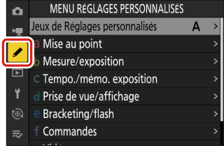 Pour afficher les réglages personnalisés, sélectionnez l’onglet A dans les menus de l’appareil photo.