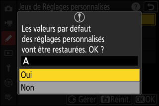 Vous pouvez rétablir les réglages par défaut d’un jeu de réglages personnalisés en particulier. Pour ce faire, mettez en surbrillance le jeu et appuyez sur O (Q) ; une boîte de dialogue de confirmation s’affiche. Mettez en surbrillance [] et appuyez sur J pour rétablir les réglages par défaut du jeu sélectionné.