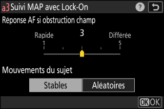 Si le mode de zone AF sélectionné est [], la « réponse AF si obstruction champ » fonctionne en mode [] lorsque [] ou [] est sélectionné.