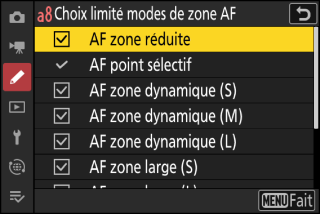 Choisissez les modes de zone AF qui peuvent être sélectionnés en appuyant sur la commande du mode de mise au point et en tournant la molette de commande secondaire.