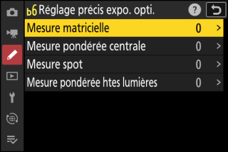 Le réglage personnalisé b6 [] affine l’exposition séparément pour chaque jeu de réglages personnalisés. Lorsque vous changez de jeu, n’oubliez pas que le réglage personnalisé b6 comporte des valeurs de réglage précis différentes.