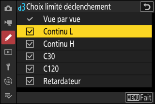 Choisissez les modes de déclenchement auxquels vous pouvez accéder en appuyant sur la commande c et en tournant la molette de commande principale lorsque le sélecteur du mode de déclenchement est positionné sur c.