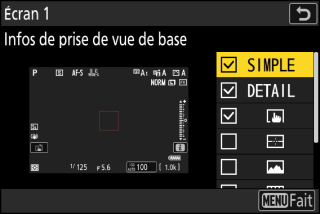 Mettez en surbrillance les options ([] à []) et appuyez sur J pour les sélectionner (M) ou les désélectionner (U). Seuls les affichages cochés (M) sont accessibles en appuyant sur la commande DISP pendant la prise de vue. Il n’est pas possible de décocher [].