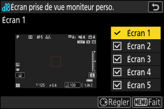 Pour choisir les indicateurs visibles sur les affichages [] à [], mettez en surbrillance l’option correspondante et appuyez sur 2. Vous pouvez alors mettre en surbrillance les éléments souhaités et appuyer sur J pour les sélectionner (M) ou les désélectionner (U).