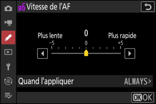 La mise au point est effectuée à la vitesse sélectionnée uniquement pendant l’enregistrement vidéo. Dans les autres situations, l’appareil photo effectue la mise au point aussi vite que possible. |