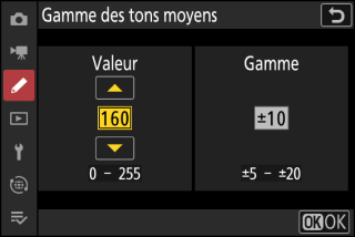 La gamme des tons moyens se définit comme une [] de luminosité et une [] de luminosités centrées sur la valeur sélectionnée.