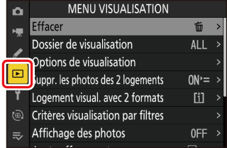 Pour afficher le menu Visualisation, sélectionnez l’onglet D (menu Visualisation) dans les menus de l’appareil photo.