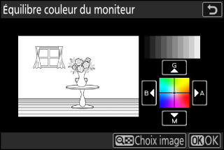 L’équilibre couleur du moniteur s’applique uniquement aux menus, à la visualisation et à l’écran de prise de vue ; les photos et les vidéos créées avec l’appareil photo ne sont pas modifiées.