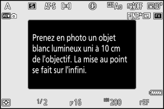 Positionnez l’objectif à dix centimètres environ d’un objet blanc, bien éclairé et uniforme. Cadrez cet objet de manière à ce qu’il remplisse l’affichage, puis appuyez sur le déclencheur à mi-course.