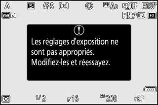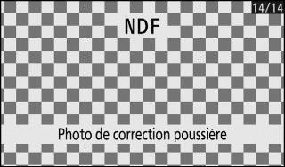 Si l’objet de référence est trop clair ou trop sombre, il est possible que l’appareil photo ne parvienne pas à obtenir les données de référence de correction de la poussière. Dans ce cas, un message s’affiche et l’appareil photo revient à l’affichage indiqué à l’étape 1. Choisissez un autre objet de référence, puis appuyez à nouveau sur le déclencheur à mi-course.