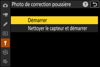 Les données de référence de correction de la poussière enregistrées avant le nettoyage du capteur ne peuvent pas être utilisées avec les photos prises après le nettoyage du capteur. Sélectionnez [] uniquement si les données de référence de correction de la poussière ne seront pas utilisées avec les photos existantes.