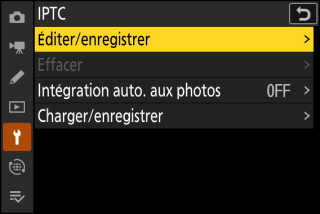 Il est possible de créer ou de modifier des pré-réglages IPTC sur l’appareil photo et de les intégrer aux photos à venir, comme décrit ci-dessous.