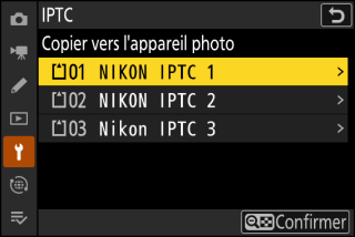 L’appareil photo peut stocker jusqu’à dix pré-réglages ; pour copier les pré-réglages IPTC d’une carte mémoire vers une destination particulière de l’appareil photo, sélectionnez [Charger/enregistrer] > [Logement 1] ou [Logement 2], puis mettez en surbrillance [Copier vers l’appareil photo] et appuyez sur 2.