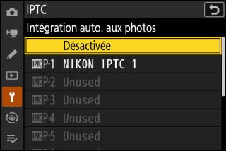 Lorsque vous mettez en surbrillance [Intégration auto. aux photos] et appuyez sur 2, une liste de pré-réglages s’affiche. Mettez en surbrillance un pré-réglage et appuyez sur J ; le pré-réglage sélectionné sera intégré à toutes les prochaines photos. Pour désactiver l’intégration, sélectionnez [Désactivée].
