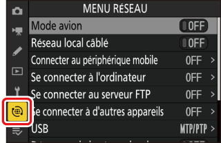 Pour afficher le menu Réseau, sélectionnez l’onglet F dans les menus de l’appareil photo.