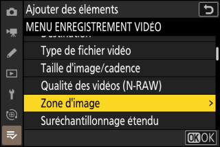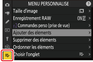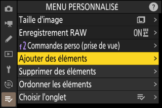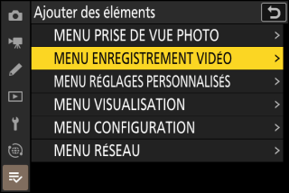 Le Menu personnalisé permet de créer et de modifier votre propre liste comportant jusqu’à 20 rubriques des menus Prise de vue photo, Enregistrement vidéo, Réglages personnalisés, Visualisation, Configuration et Réseau. Vous pouvez ajouter, supprimer et réorganiser les rubriques de la manière décrite ci-dessous.