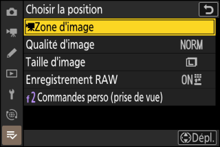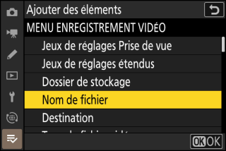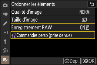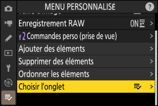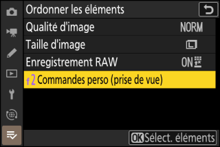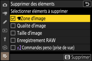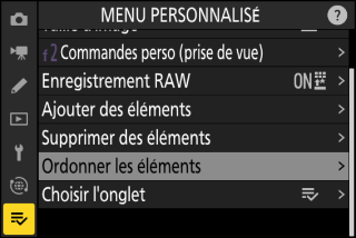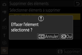 Pour supprimer une rubrique du menu [], mettez-la en surbrillance et appuyez sur la commande O (Q) ; une boîte de dialogue de confirmation s’affiche. Appuyez à nouveau sur O (Q) pour supprimer la rubrique sélectionnée.