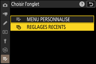 Si vous sélectionnez [] > [], les rubriques indiquées à l’étape 2 de « Affichage des [] » s’affichent (Affichage des [RÉGLAGES RÉCENTS]). Mettez en surbrillance [] et appuyez sur J pour afficher le Menu personnalisé.