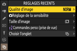 Les rubriques de menu s’ajoutent en haut du menu des [] au fur et à mesure qu’elles sont utilisées. Les vingt derniers réglages utilisés