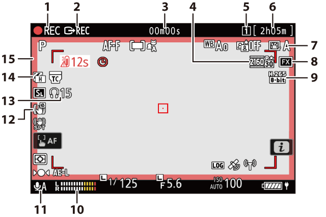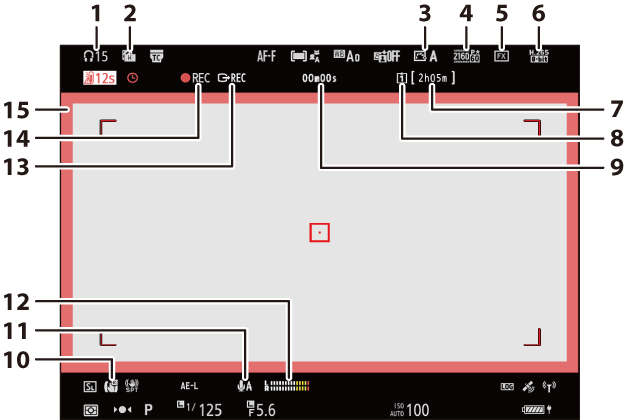 Indicateur d’enregistrement (cadre rouge ; g17 : Cadre REC rouge) |