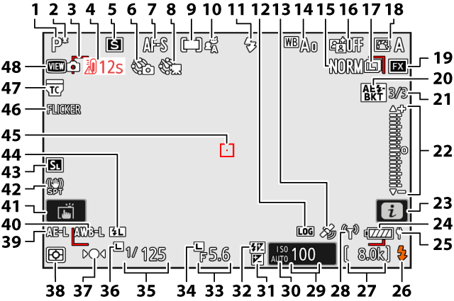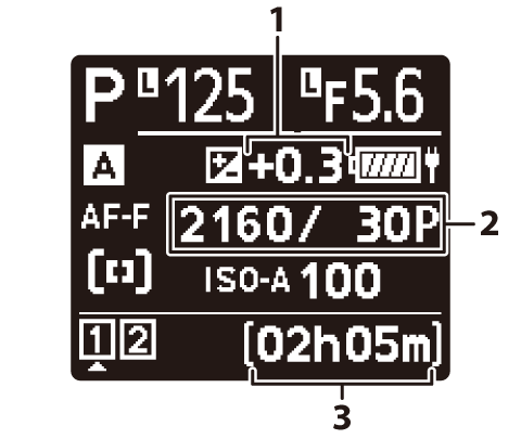 Mode de déclenchement (Mode de déclenchement) Capacité de la mémoire tampon (Mode de déclenchement) Capacité de la mémoire tampon (prise de vue haute vitesse ; Prise de vue haute vitesse (C30/C120)) Indicateur du mode intervallomètre (Photographie en mode intervallomètre) Indicateur de time-lapse (Enregistrement des vidéos time-lapse) Indicateur du décalage de la mise au point (Photographie avec décalage de la mise au point) |