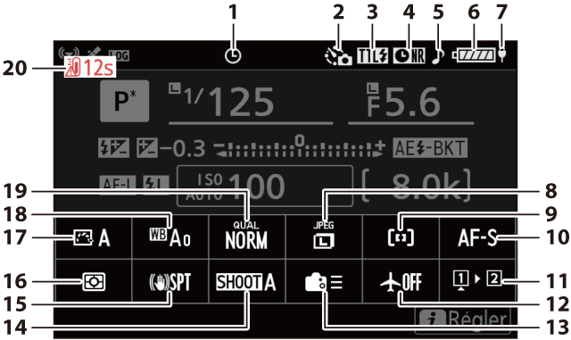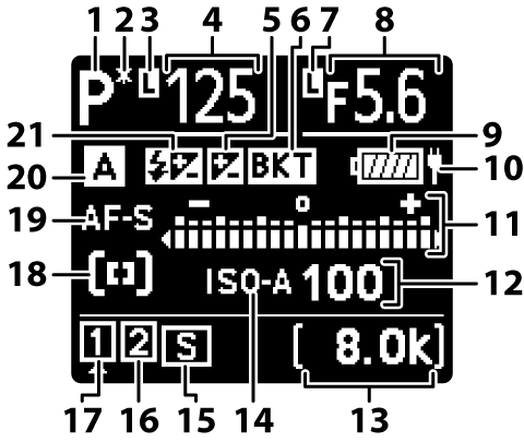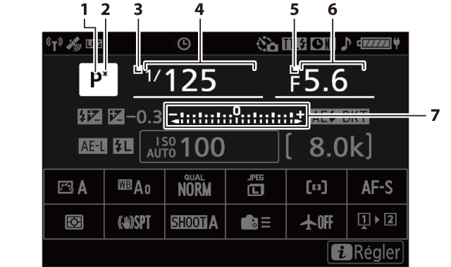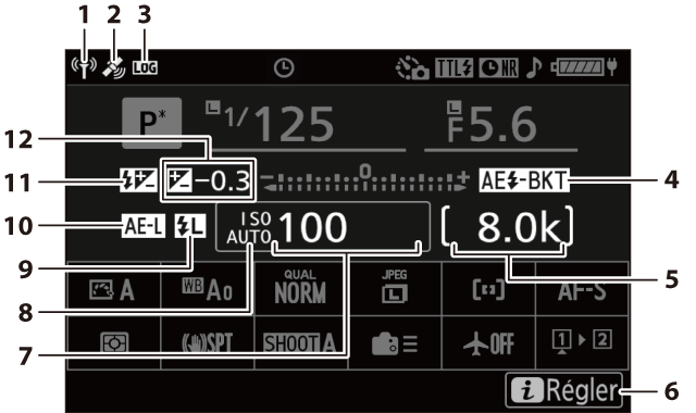 Ouverture (A (Auto à priorité ouverture), M (Manuel)) Incrément de bracketing de l’exposition et du flash (Bracketing de l’exposition et du flash) Incrément de bracketing de la balance des blancs (Bracketing de la balance des blancs) Nombre de prises de vues pour la séquence de bracketing du D‑Lighting actif (Bracketing du D‑Lighting actif) Compteur de vues de l’intervallomètre (Photographie en mode intervallomètre) Compteur de vues du décalage de la mise au point (Photographie avec décalage de la mise au point) Indicateur de signal satellite (Indicateur de signal satellite) Indicateur de connexion Wi‑Fi (Connexion en Wi‑Fi (mode Wi‑Fi), Réseau local sans fil, Réseau local sans fil) Indicateur Bluetooth (Association (Bluetooth)) Connexion à l’ordinateur (Logiciels) |