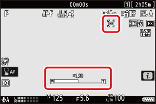 Pour effectuer un zoom avant ou arrière pendant le tournage, appuyez sur 4 ou 2 ou utilisez les commandes auxquelles [] et [] ont été attribués via le réglage personnalisé g2 []. Vous pouvez effectuer un zoom avant jusqu’à 2,0×.