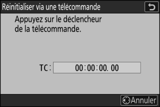 Lorsque vous sélectionnez [], une boîte de dialogue de réinitialisation du code temporel s’affiche. Appuyez sur le déclencheur de la WR‑T10 pour réinitialiser le code temporel.
