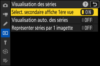 Sélectionnez [] pour ignorer toutes les vues de chaque rafale sauf la première, lorsque vous faites défiler les photos en inclinant le sélecteur secondaire vers la gauche ou la droite. Les photos ne faisant pas partie des rafales ne sont pas ignorées. Vous pouvez afficher les vues individuelles de chaque rafale en inclinant le sélecteur secondaire vers le haut ou le bas.