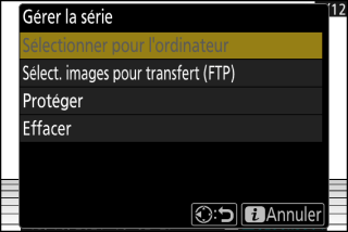 La rubrique [] est affichée dans le menu i de visualisation lorsque [] est sélectionné pour []. Elle permet de protéger, de supprimer ou de transférer sur un ordinateur ou un serveur FTP toutes les photos de rafales sélectionnées au préalable.