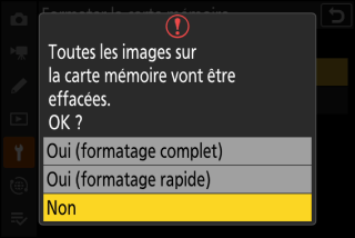 Sélectionnez [], puis [] lorsque vous y êtes invité, pour formater entièrement la carte mémoire CFexpress.