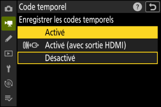 Les codes temporels ne seront pas enregistrés si [] est sélectionné comme [] dans le menu Enregistrement vidéo.