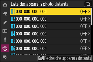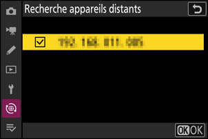 L’appareil photo principal détecte uniquement les appareils photo distants Z 9 dotés du firmware « C » mis à jour vers la version 5.30. Pour établir une connexion à d’autres appareils photo distants, saisissez leurs adresses IP manuellement dans la [Liste des appareils photo distants].