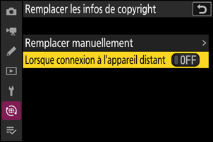 | [Remplacer manuellement] | Si vous appuyez sur J, les informations de copyright enregistrées dans les appareils photo distants connectés actuellement et dans le même groupe sont remplacées par les informations de copyright enregistrées dans l’appareil photo principal. |