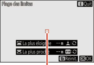 • Positionnez le point AF sur un sujet situé à la distance la plus éloignée et appuyez sur le déclencheur à mi-course pour définir la distance maximale. Tournez la molette de commande secondaire ou maintenez appuyé le déclencheur à mi-course tout en tournant la bague de mise au point de l’objectif pour affiner la distance maximale.