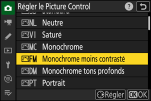 - [Monochrome moins contrasté] et [Monochrome tons profonds] ont également été ajoutés au Picture Control d’origine sur lequel est basé le Picture Control personnalisé dans [Gérer le Picture Control] dans les menus Prise de vue photo et Enregistrement vidéo.