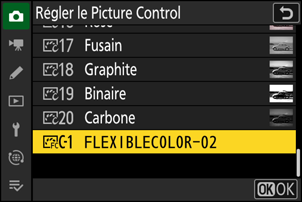 Les Picture Control exportés vers les cartes mémoire seront ajoutés à la liste des Picture Control au moment de leur importation dans l’appareil photo via [Gérer le Picture Control] dans le menu Prise de vue photo ou Enregistrement vidéo.