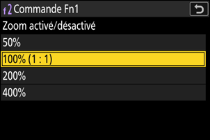Une option de grossissement de [400%] a été ajoutée à [Zoom activé/désactivé] pour les réglages personnalisés f2 [Commandes perso (prise de vue)] et g2 [Commandes personnalisées]. Nous avons également remplacé les noms des autres options par :