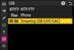1. Appareil photo : sélectionnez [USB] dans le menu Réseau, mettez en surbrillance [Streaming USB (UVC/UAC)] et appuyez sur J.