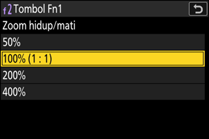 Sebuah opsi perbesaran [400%] telah ditambahkan ke [Zoom hidup/mati] yang tersedia bagi Pengaturan Kustom f2 [Kontrol kustom (pemotretan)] dan g2 [Kontrol kustom]. Kami juga merubah nama dari opsi lainnya ke: