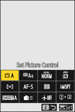 Premendo il pulsante i durante la fotografia vengono visualizzati gli elementi elencati di seguito. Evidenziare la voce desiderata utilizzando il multi-selettore e premere J per visualizzare le opzioni.