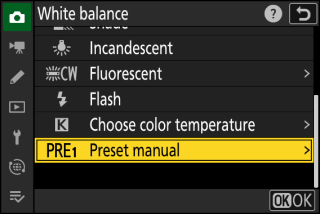 Le preimpostazioni del bilanciamento del bianco possono essere visualizzate selezionando [ ] > L [ ] nel menu di ripresa foto. Per richiamare un valore memorizzato, evidenziare una preselezione utilizzando il multi-selettore e premere J .