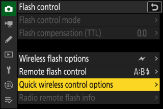 Le opzioni del flash di gruppo possono essere visualizzate utilizzando la voce [ ] nel menu i , che può essere aggiunta al menu utilizzando l'impostazione personalizzata f1 [ ].