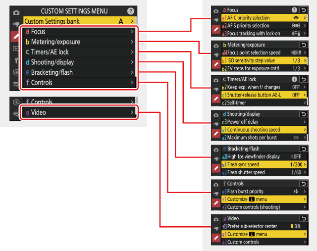 Le impostazioni personalizzate vengono utilizzate per personalizzare le impostazioni della fotocamera in base alle preferenze individuali. Il menu Impostazioni personalizzate è diviso in due livelli.