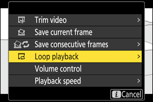 Abbiamo aggiunto un [ Riproduzione in loop ] al menu i riproduzione video visualizzato mentre la riproduzione è in pausa. Ripeti una sezione specifica del filmato selezionando i punti di inizio e fine nel video.
