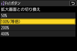 カスタムメニューf2[カスタムボタンの機能(撮影)]およびg2[カスタムボタンの機能]で割り当てられる[拡大画面との切り換え]に[400%]が追加されました。それに伴い既存の設定項目の名称も次のように変更されました。