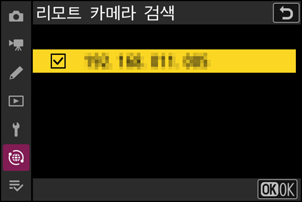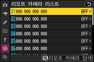 마스터 카메라는 “C” 펌웨어가 버전 5.30으로 업데이트된 Z 9 리모트 카메라만 인식합니다. 다른 리모트 카메라에 연결하려면 [리모트 카메라 리스트]에 IP 주소를 수동으로 입력하십시오.