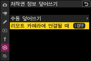 [리모트 카메라에 연결될 때] [ON]을 선택하면 연결될 때 마스터 카메라에 저장된 저작권 정보가 리모트 카메라의 저작권 정보를 덮어씁니다.