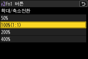 [400%] 배율 옵션이 사용자 설정 f2 [사용자 제어 설정(촬영)] 및 g2 [사용자 제어 설정]에서 사용할 수 있는 [확대/축소전환]에 추가되었습니다. 다른 옵션의 이름도 다음과 같이 변경했습니다.