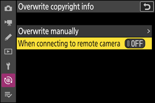 | [ Perrašyti rankiniu būdu ] | Paspaudus J visų tuo metu toje pačioje grupėje prijungtų nuotolinių fotoaparatų autorių teisių informacija perrašoma pagrindiniame fotoaparate saugoma autorių teisių informacija. |